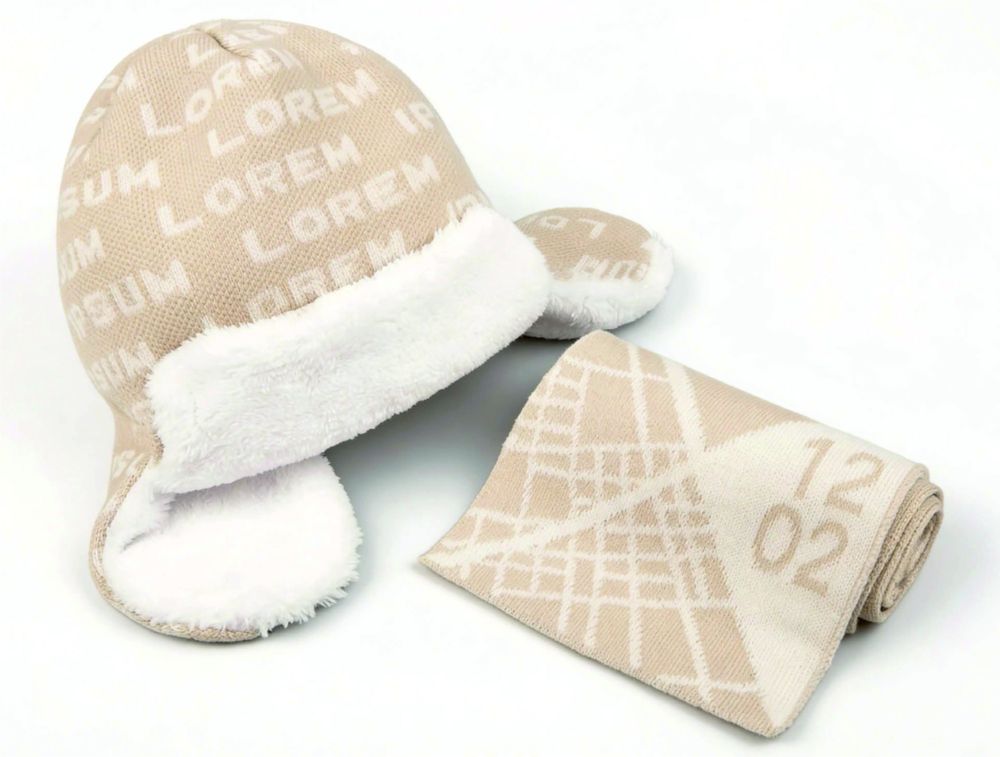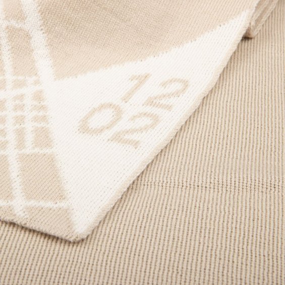 Шарф с вывязанным логотипом и индивидуальным рисунком в фирменной цветовой гамме.