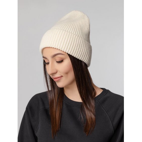 Шапка-бини из полушерстяной пряжи актуальных приглушенных оттенков. Трендовый фасон с удлиненным верхом — для расслабленного повседневного образа.