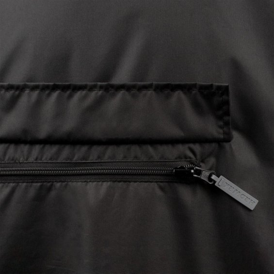 Дождевик-анорак с капюшоном и карманом на молнии спереди. Выполнен из ткани дюспо с матовой поверхностью — легкой, мягкой на ощупь, но устойчивой к повреждениям. Она не шелестит и практически не мнется. Благодаря пропитке дюспо обладает отличными водоотталкивающими и ветрозащитными свойствами.