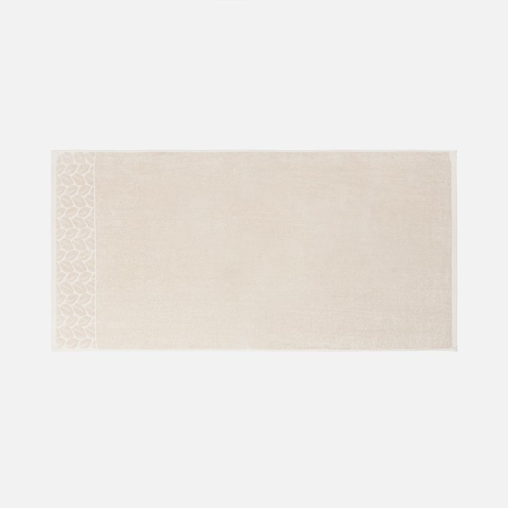 Светлые оттенки в сочетании с широким бордюром с рельефным растительным узором придают полотенцу элегантный и свежий вид.