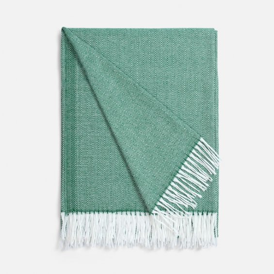 Классический рисунок «елочка» не слишком привлекает внимание, но в то же время добавляет изюминки. Смешанный состав пряжи продлевает срок службы и существенно облегчает уход за пледом.